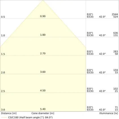 De gradenbundel geeft informatie over hoe breed het licht wordt uitgestraald. Dit zit tussen de 0 en 360 graden (D). Hoe kleiner de hoek, hoe specifieker de lichtbundel is. Over het algemeen is een smalle gradenbundel perfect voor sfeer- of accentverlichting, terwijl een brede gradenbundel ideaal is om grote oppervlaktes te verlichten.