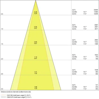 De gradenbundel geeft informatie over hoe breed het licht wordt uitgestraald. Dit zit tussen de 0 en 360 graden (D). Hoe kleiner de hoek, hoe specifieker de lichtbundel is. Over het algemeen is een smalle gradenbundel perfect voor sfeer- of accentverlichting, terwijl een brede gradenbundel ideaal is om grote oppervlaktes te verlichten.